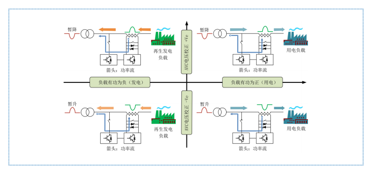 當負載為發(fā)電狀態(tài)(有功功率為負)時,電源側(cè)電壓發(fā)生暫升,整流器從電網(wǎng)側(cè)獲取能量,逆變器 又把獲取的能量通過變壓器注入到主回路中,以補償電壓的暫升。