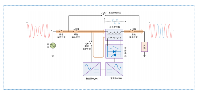 HTAVC 時刻監(jiān)測輸入側(cè)電源電壓,一旦發(fā)生電壓暫降或暫升,控制單元控制逆變器向串聯(lián)的注入變壓器注入適當?shù)难a償電壓,快速將負載端電壓調(diào)節(jié)到額定值,從而減少來自電網(wǎng)輸入端的電壓暫降、暫升等對負載的影響。