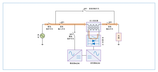 HTAVC 在自身設(shè)備發(fā)生故障時會自動轉(zhuǎn)為內(nèi)部旁路供電,旁路快速響應(yīng)由晶閘管切換完成,旁 路保持由機械觸點完成。此時,逆變器不生成補償電壓,市電通過注入變壓器主回路側(cè)繞組直接為負載供電。