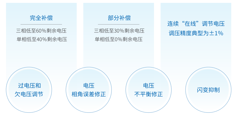 電壓暫降補償、電壓暫升補償、相角誤差修正、電壓不平衡修正、連續(xù)在線調(diào)壓、電壓波動與閃變